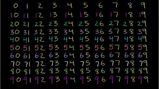 이런 유레카. 이게 사실이면 핵심은 시각화인 게 아닌가. 우리가 주로 사용하는 10진수 개념을 가장 잘 표현하는 방법은 아래 그림과 같이 0에서부터 시작해서 99까지를 2차원 배열로 나타내는 것이라고 생각한다. 7~8년 전 Khan Academy라는 게 있다는 걸 알고 나서 영상을 본 뒤로 언젠가 아이한테 숫자를 가르쳐야 할 날이 오면 써먹어야지 라고 기억해뒀던 방법인데, 보통 숫자 세기를 배울 때 1부터 시작해서 10까지, 그리고 100까지 세기 때문에 아래쪽 그림과 같이 한자리 숫자(1~9)부터 세자리 숫자(100)까지 한 판에 표시되는 것과 달리, 실질적으로 0~9가 1차원 개념이고, 앞에 생략된 0이 붙어서 00~09라는 것만 받아들이면 2차원 개념에서 00~99까지 모두 두(2차원이니까)자리 숫자로 표시된다는 것을 나타낼 수 있는 방법이다.